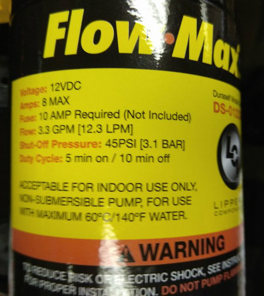 The Flow Max is an interesting new entry to the RV marketplace in that it is actually manufactured by Seaflo, the manufacturer of the other two pumps. Upon inspection, it appears to be exactly the same as the Seaflo 33 series pump above. However, inferior components were selected such as the 200 hour motor giving the Lippert a duty cycle of only 5 minutes on and 10 minutes off. This can be seen right on the label of the pump above. This could be a problem for the average RV/Marine use both for every day use and longevity of the pump. It would seem that showers and usage has to be limited to 5 minutes of usage with a 10 minute rest period. That could be very inconvenient for the RV shower enthusiast. Additionally, the Lippert was the loudest pump in the comparison by far. The 5 minute duty cycle coupled with a mere 2 year warranty, it is hard to see why anyone would want to buy this pump over the two actual Seaflo branded choices available.